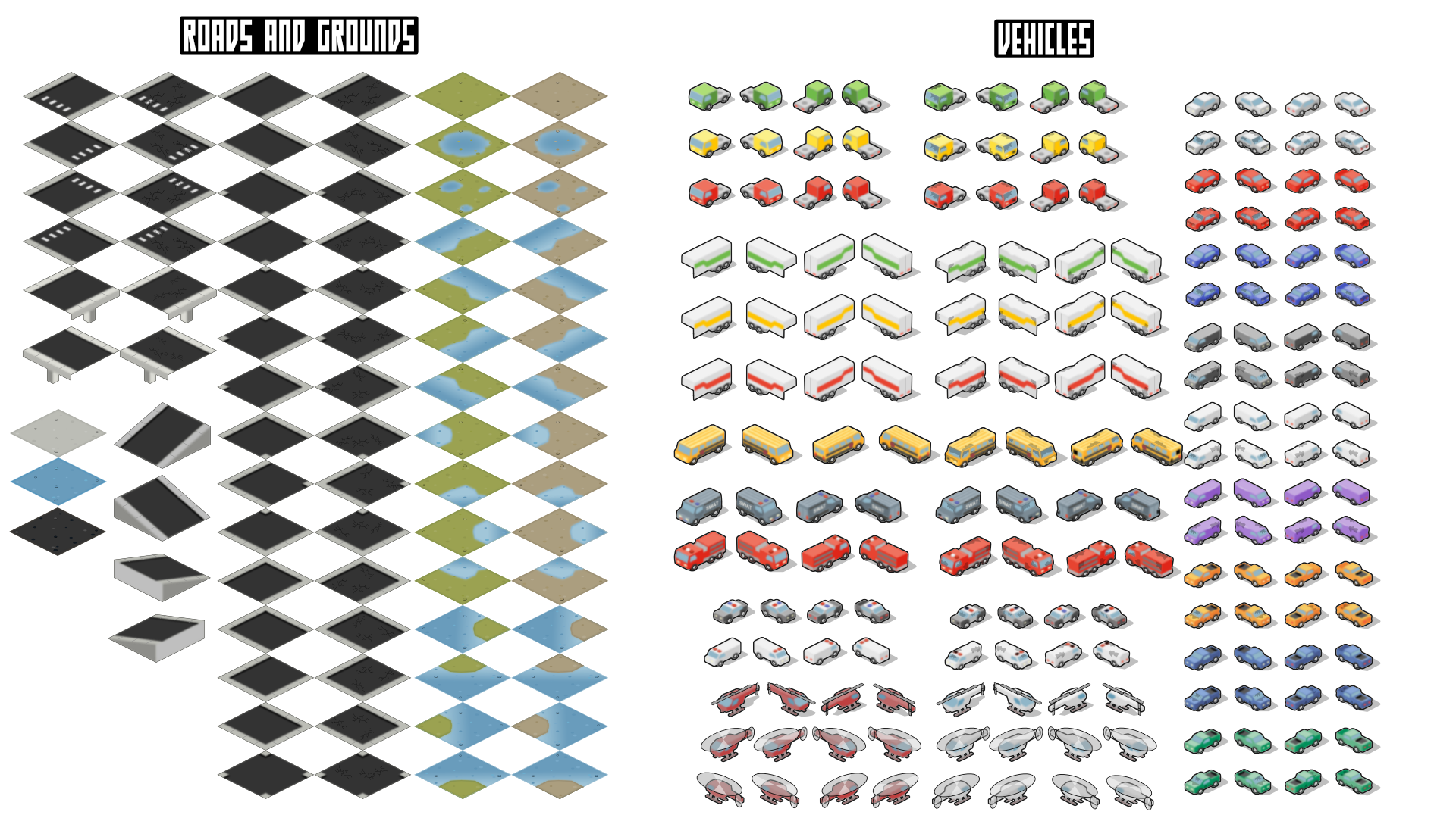 Updated my most popular asset pack. Roads and grounds tiles redone and all sprites retouched to look better, the pack contains a total of 472 sprites